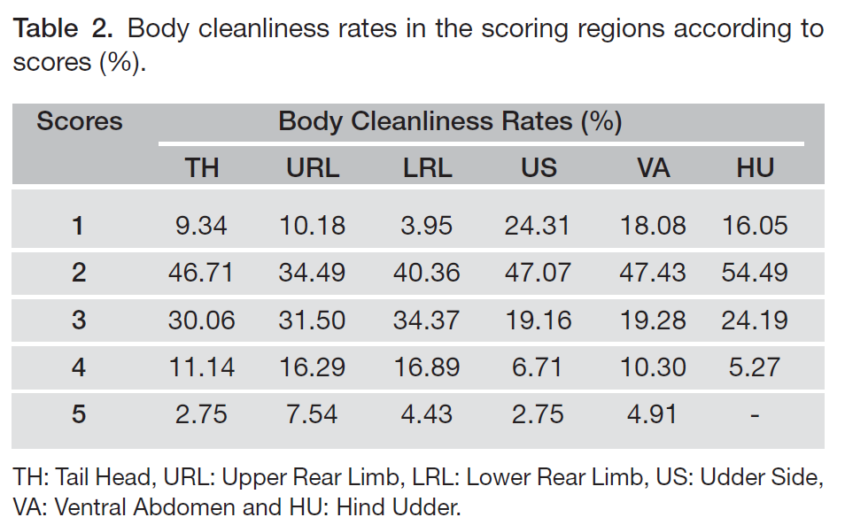 According to Table 2, the highest body cleanliness rates (%) by scoring regions, 2 and 3 scores were observed in the TH, URL and LRL regions. However, it is observed that 1, 2 and 3 body cleanliness scores are concentrated in the TH and US regions in this herd. Neja et al.19 stated that over 33% of the cows were