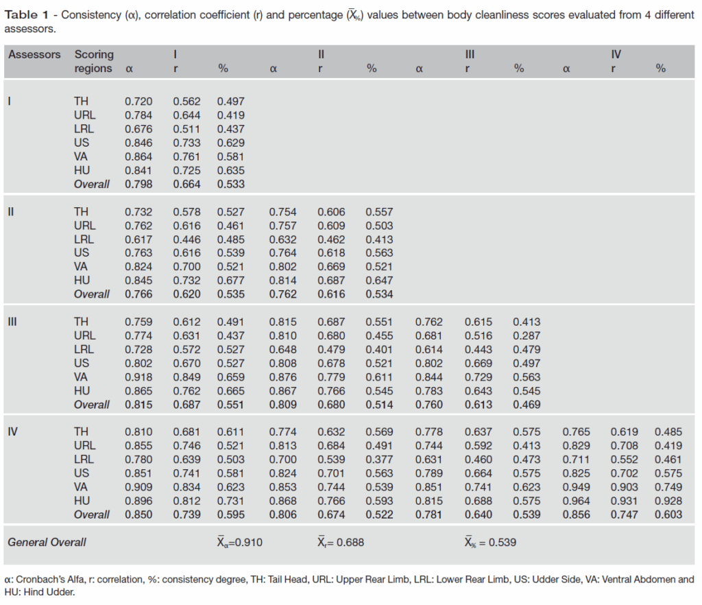 Cattles were assessed and scored according to body cleanliness. Then, consistency between body cleanliness scores was evaluated from 5 different assessors. So, five assessors were taken into consideration for compliance in the analysis (P<0.01). Consistency (α), correlation coefficient (r) and percentage (X%) values