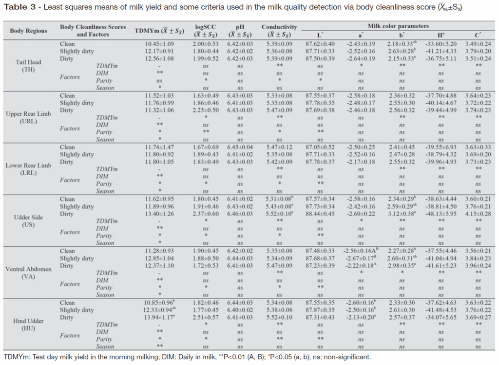 is also an indicator of udder health and welfare of dairy cows. In this study, least squares means of milk yield and some criteria used in the detection milk quality via body cleanliness score are given in Table 3.