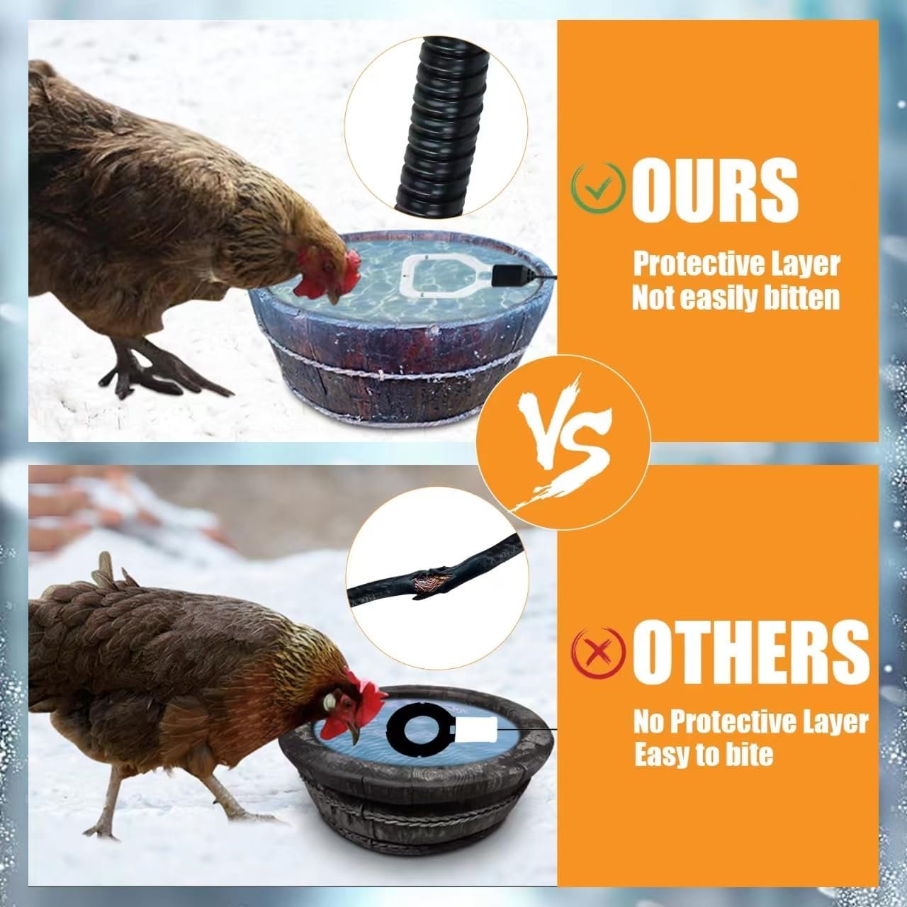 - ENHANCED SAFETY FEATURES – With our newly upgraded bird bath heater, we have added a unique design of a protective cover for the power cord. It effectively prevents poultry or animals from chewing and does not conduct electricity. The de-icer can touch the metal part during the working process, safe and reliable!